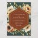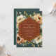 Evoke a sense of moody romance with this elegant artistic design. A stunning bouquet of lush cream and peach peonies blooms against a deep teal background. Touches of light blue and soft green foliage add a delicate contrast, creating a rich, painterly composition perfect for an autumn union.