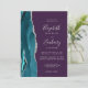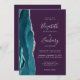 The left-hand edge of this elegant modern wedding invitation features a teal blue watercolor agate border trimmed with faux silver glitter. The customizable text combines silver gray handwriting, copperplate and italic fonts on a purple background. The reverse side provides space for wedding details on a solid purple background, along with a QR code guests can scan to visit your website and RSVP, which saves the cost of printing and mailing separate RSVP cards.