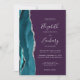 The left-hand edge of this elegant modern wedding invitation features a teal watercolor agate border trimmed with faux silver glitter. The customizable text combines handwriting, copperplate and italic fonts in silver gray on a purple background. The reverse side features a matching teal and silver agate design.