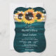 Convite de casamento floral Rústico Teal com flores de sol, burlap e local contra fundo de madeira de celeiro adornado com luzes de cordas. Design de cartão perfeito para convidar seus hóspedes para sua festa de casamento rústica teal inspirada pelas flores de girassol.