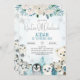 Teal Winter Animal Winter Winter Onederland Birthday Sweet faux prata glitter, animais de inverno de um menino floral convite para o aniversário de uma terra firme para que a cena de uma primeira festa de aniversário do tema do inverno seja definida. O convite para o aniversário de um derland deste menino apresenta um falso cabeçalho de prata e flocos de neve monofilados, seis animais de inverno, algumas árvores de pinta e um adorável arranjo floral.