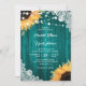 Um convite de casamento floral de teal russo com girassóis, hálito de bebê e eucalipto em um fundo de madeira rústica adornada com rendas florais brancas e luzes de cordas. Dois corações de burlap e um delicado lugar floral branco no fundo.