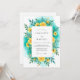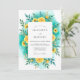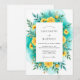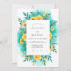 This design features a vibrant combination of luminous yellow roses and cheerful sunflowers nestled among lush green foliage. A soft teal watercolor wash creates an artistic backdrop, evoking a serene and refreshing summer atmosphere. The palette of bright yellow and deep teal provides a striking contrast.