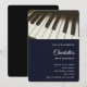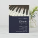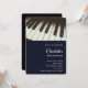 Um convite de aniversário com uma fotografia temática musical apresentando imagem aproximada de teclas de piano pretas e brancas.