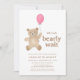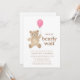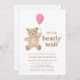 This charming girl's baby shower invitation is decorated with a watercolor teddy bear and a pink balloon. It says "We can bearly wait" in simple typography and is easily customizable.