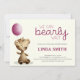 Este adorável convite para chá de fraldas de ursinho colocará um sorriso nos rostos dos seus convidados. O fundo de creme macio combinado com tons cor-de-rosa é perfeito para um chá de fraldas de menina. Este simples e fofo design tem uma bela e divertida tipografia de roteiro que diz "podemos esperar muito" para completar este encantador convite de urso. Ilustrada e projetada por Patricia Alvarez.