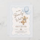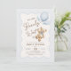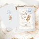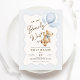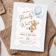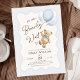 Podemos esperar o convite para chá do bebê. Design do urso de pelúcia em cores azuis, castanho, bege e creme neutro. Apresenta uma estrutura ondulada moderna, ursinho de pelúcia agudo, balões e fontes de script. Perfeito para uma elegante celebração de chá de fraldas. Personalize com seus próprios detalhes. Impressos convites Zazzle ou modelo de impressão digital instantânea para download.
