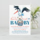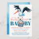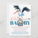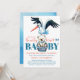 Urso de peluche com uma cegonha de folheto ali em azul. Modelo de festa de chá do bebê. Convida informações personalizadas sobre sobrenomes, nomes dos pais, data, endereço e rsvp e armazenamento(s) registrado(s).