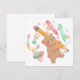 A cute illustration of a teddy bear carrying a pencil with fluffy monsters carrying other school supplies