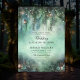 Um convite de casamento de conto de fadas escuro com um tema de floresta encantado! Uma ilustração com uma aquarela esbranquiçada da folhagem esmagadora em verde esmeralda, cintilante com luzes de fadas e poeira mágica, decora este primavera de verão cair no convite mágico da floresta. As lanternas penduradas iluminam-se à noite e as matizes esmeraldas profundas e a caligrafia elegante fazem um perfeito casamento mágico de floresta escura. Um convite elegante e moderno para um casamento romântico escuro, um casamento de conto de fadas escuro, um casamento romântico escuro ou um casamento viking. Perfeito para noivas que amam a vibração romântica escura, o cenário da floresta de conto de fadas, o tema da floresta de fadas ou do jardim de fadas e o verde esmeralda.