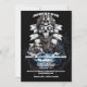 Um gráfico de aquarela 3D em 3D impressionante de um crânio montado num posto metálico. Está rodeada por um fundo negro e tem ondas oceânicas azuis a bater-se contra ele, nas quais se pode ver um navio pirata. O crânio tem diamantes para os olhos e tem uma aparência assustadora. Modelos brancas editáveis para o seu texto personalizado aparecem abaixo da ilustração que é ideal para adultos e adolescentes que hospedam um pirata de matey ahoy com tema náutico.
