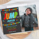 Comece a diversão de aniversário com este enérgico convite de aniversário Jump com foto! Apresentando letras em negrito, silhuetas de trampolim divertidas e um layout personalizável de fotos, este design editável é perfeito para crianças ativas que adoram pular e brincar. Adicione facilmente o nome, a idade, os detalhes da festa e a foto favorita do seu filho usando as ferramentas simples de design do Zazzle. Ideal para festas de parques de trampolim ou comemorações de tomografia interna.