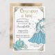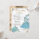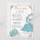 Esse convite de festas mágico e encantador apresenta um tema ilustrado de conto de fadas da Cinderela. A frase clássica de conto de fadas Uma vez em um tempo é impressa no topo em um padrão dourado. Várias imagens de desenhos animados da história são fotografadas ao redor da fronteira. Um quadro de estilo vintage borda o convite para lhe dar uma aparência antiga de um livro de histórias. O centro apresenta um vestido de bola azul e relógio. Uma carruagem de princesa e um escorregador de vidro são pintados no fundo.