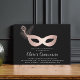 Os convites elegantes de mascarada para a celebração da quinceanera contêm uma máscara de penas em folha de ouro falso de rosa num fundo preto rico. Personalize com os detalhes do seu partido abaixo em um script de caligrafia branca e em caracteres modernos de blocos.
