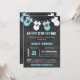 Tema desportivo incrível e único convites para duches de bebês para rapazes. Futebol, futebol, basquetebol e baseball no fundo do quadro e nos macacões para bebês. Cor azul e branca. Modelos de convite. Texto editável. Obter adesivos correspondentes!
