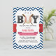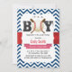 Tema de basebol Blue Chevron Stripes Red Ribbon É um Boy Baby Shower Invices.