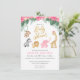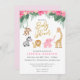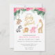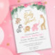 Celebrar a garotinha a caminho com estes adoráveis convites para o bebê safari! Os bebês-animais doces, emparelhados com folhas tropicais, texto dourado, flores tropicais cor-de-rosa e sotaques cor-de-rosa, são perfeitos para chás de bebês. Com macaquinho giro balançando na vinha, zebra stripey, leão giro, elefante aspergaminho e girafa curiosa. Fácil de adicionar seus próprios detalhes para um super divertido chá de tema "selvagem" ou safari!
