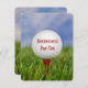 Feche uma bola branca de golfe sobre uma teta vermelha na grama para convite de festas de aposentadoria.
