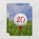 Feche uma bola branca de golfe sobre uma teta vermelha na grama para o convite de aniversário de 20.