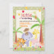 O tema da selva PixDezines para uma festa de aniversário divertida. Com bebês, hipopótamos cor-de-rosa, elefante roxo, girafa bolinhas amarela, filhote de tigre, assim como um macaco castanho-bochecho andando sobre uma cabeça de elefante. A impressão em zebra é um toque final no fundo.