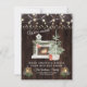 Design de cartão único com árvore de Natal, lareira, velhas lâmpadas com vela, folhagens de inverno, luzes de corda em um fundo de madeira de celeiro antigo. Use a ferramenta Personalizar para adicionar suas informações. Veja, também, minha Coleção Temos Mudado.