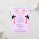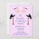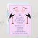 Cegonete branco segurando feixes de bebês bichos rosa e gêmeos em um convite de chá de fraldas para meninas. Personalize com as informações e o local do evento. Típica fofinha em azul. Grande pacote de bebês no lado inverso do convite!