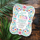 Mariachi, margaritas e memórias! Atirem a festa com este design de festa popular mexicano. O texto colorido e a trabalho de arte (desenhada à mão pela própria Lively Scribe) dão a esta design uma vibração peculiar, mas elegante. Perfeito para o latinx na sua vida. Ou uma festa que é convenientemente próxima de Cinco de Mayo ou Dia de los Muertos. Solicite seus convites impressos e suprimentos de festas ou faça o download de seus convites digitais agora por um dia que eles nunca esquecerão!