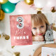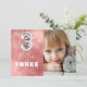 Terceiro convite de aniversário moderno para a criança, desenhado com uma foto do aniversariante/menina, um fundo cor-de-água cor rosa, confete de bolha transparente e um grande balão de hélio número três. O nome da criança está escrito em texto branco em grande caligrafia com um simples modelo de aniversário por baixo que é fácil de personalizar.