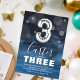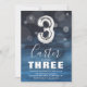 Terceiro convite de aniversário moderno para sua criança, projetado com um fundo azul-impermeável, confete de bolha transparente e um balão grande de hélio número três. O nome da criança está escrito em texto branco em grande caligrafia com um simples modelo de aniversário por baixo que é fácil de personalizar.