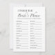 Apresentando o cartão de jogo "Finish The Bride's Phrase", um delicioso jogo de chá de panela preto e branco minimalista projetado pela CaMiDesigns. Esta carta elegante convida os convidados a completar frases divertidas e sentidas, criando uma experiência memorável e envolvente para a noiva e seus entes queridos. Perfeito por adicionar um toque de criatividade e riso a qualquer celebração de chá de panela. Para obter assistência com pedidos, envio, informações sobre produtos e muito mais, entre em contato diretamente com o Atendimento ao Cliente da Zazzle.