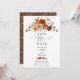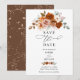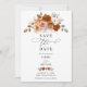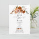Cartão de "Save the Date" floral em terracota queimada e laranja, apresentando rosas pintadas à mão e detalhes botânicos quentes de outono.