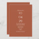 Um design moderno minimalista com sua data especial e detalhes de casamento definidos em tipografia clássica e chic em um fundo de terracota. Com todas as suas informações especiais sobre o dia do casamento, incluindo seu RSVP, acomodações e detalhes adicionais. Projetado por Thisnotme©