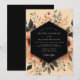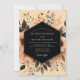 A romantic and artistic design featuring a beautiful botanical arrangement. Soft, painterly blooms in shades of terracotta and warm peach are set against a creamy background. These delicate blossoms are dramatically contrasted by inky charcoal leaves and sprigs, creating a sophisticated and moody atmosphere for your nuptials.