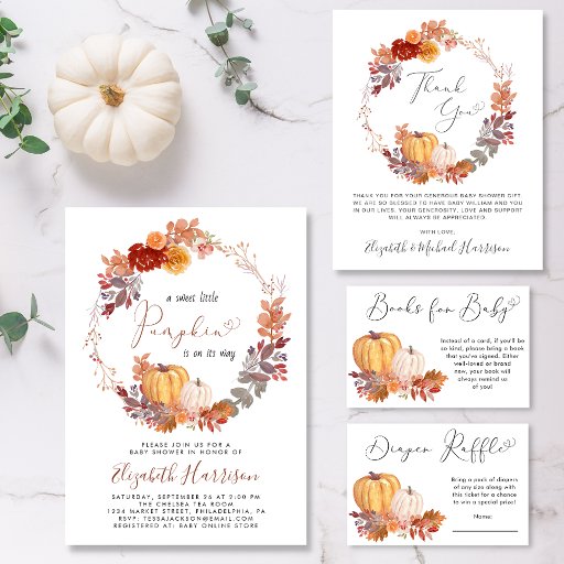 Um convite para o chá de fraldas, no outono, com uma coroa rústica composta por ilustrações aquarelas de abóboras e de terracotta, laranja queimada e verde-sábio e verde-verde, e "uma abóbora doce está a caminho", escrito numa mistura de simples tipografia e um roteiro na moda de terracota com um inchaço cardíaco. Especifique o sexo do bebê, se desejado (por exemplo, "está a caminho").