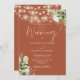 Este elegante convite para o casamento do terracotta, com luzes bonito de cordas e verde floral, pode ser personalizado com suas informações em tipografia quic com seus detalhes no website do casamento e seu código QR no verso. Projetado por Thisnotme©