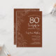 Floral Terracotta Boho Burnt Orange Surprise 80 Convite de aniversário. Design minimalista moderno com sotaques botânicos e letra de escrita tipográfica. Simples cartão de convite floral perfeito para uma festa surpresa na moda. Pode ser personalizado para qualquer idade. Impressos convites Zazzle ou modelo de impressão digital instantânea para download.