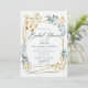 Um elegante chá de panela geométrico de ouro geométrico de terrário que apresenta um design de quadros geométricos em camadas douradas e borboletas douradas (efeitos digitais) com folhagem de eucalipto azul, bem como uma caligrafia moderna num fundo de marfim moderno. Elegante e chic, é o convite perfeito para um chá de panela formal e tradicional com um toque de choramingos, ou um almoço de noiva no jardim do quintal, um brunch ou uma festa para uma noiva que ama vassoura e borboletas.