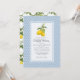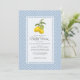 Projetado para um chá de panela usando a rotulação do roteiro da tipografia da caligrafia. Os trabalhos de arte frescos, coloridos por Audrey Jeanne Roberts eram pintados mão. Na parte dianteira é teste padrão do impressão do diamante um mini em um azul e em um branco limpos torrados com um conjunto de limões, de folhas e de flores do citrino. O verso deste convite caracteriza a treliça de limões, de flores do limão e das folhas mais espalier. Um grupo completo de decoração nupcial e do casal de chá do partido está disponível para combinar. Direitos reservados Audrey Jeanne Roberts da arte, todos os direitos reservados.