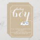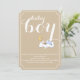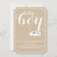Bebê adormecido chá elegante texto com estilo mínimo de ingresso convite com o texto bebê em branco no papel estilo artesanato em bege e um bebê beyboyl em roupas azul claras dormindo em uma nuvem e na lua da crescente amarela. Há uma fronteira dupla em torno dela. Ainda é moderno, com um talento vintage. Esta tendência de na moda e um design personalizado minimalista e fofo é completamente personalizável. Você pode mudar a cor de fundo. Alguns elementos de Trina Clark.