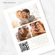 Texto Dourado Elegante 3 Fotos Fronteira de Linha Código QR Casamento. Disponível digitalmente e impresso. Totalmente personalizável. Substitua as três fotos no verso por você e adicione um código QR ao seu site de casamento para a conveniência de seus convidados digitalizarem para o rsvp e verem mais detalhes. Você também pode alterar a cor do texto e do plano de fundo em cada lado, se desejar, por meio da opção editar mais.