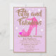 Cor-de-rosa Cinquenta e Convite de aniversário fabuloso com texto Dourado e calçado de alto salto rosa quente com brilho rosa. Borda Dourada e pontos brancos em segundo plano. Suas informações na parte frontal e traseira são as mesmas design e cores, mas nenhum texto.