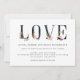 Este elegante convite para o casamento traz a palavra "amor" em negrito texto preto com a aquarela que parece rosa-claro e flores douradas, para um olhar moderno e dramático.