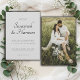 Um simples guião manuscrito moderno e minimalista casamento de tipografia com um convite de textura de linho gravado, com sua foto de casamento no verso. Substitua a foto de amostra pela sua própria foto de casamento. Use a ferramenta design simples para alterar a fonte ou digitar a cor. Disponível em impressão, como download digital ou ambos.
