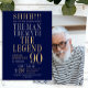 His life has been a great adventure! This fabulous navy blue men's 90th birthday surprise party invitation that says "The Man The Myth The Legend" in a classic font in silver and gold would be perfect for asking people to join you as you celebrate the man in your life's 90th birthday. This invitation is trendy, stylish, modern and contemporary. The photo on the back makes it just that much more special. To see your unique invitations select "Personalize this template" and type in your information and upload a favorite photo. It's super easy!