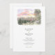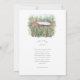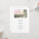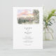 This two-sided wedding invitation features a charming watercolor illustration of a The Pallet Barn nestled in lush Christmas trees. Loose ink outlines define the wooden structure, while soft washes of evergreen, sepia, and muted gold capture the texture of the trees and the surrounding landscape. On the front, a scenic country lane lined with fencing leads the eye toward the barn under a dreamy pastel sunset sky, creating a romantic sense of arrival and place.