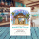 O convite para o aniversário de adultos do partido Tiki apresenta um bar de aquarela na praia à noite sob a lua e estrelas com palmeiras, lanternas de cordas, tochas de Tiki e uma saudação "Aloha". Cocktails tropicais, abacaxi, hibisco e folhas de palma, prancha de surfe e papagaio num pirata que decora a área do bar. O verso é uma pintura de tábuas de madeira rústicas que se coordenam com a cabana de Tiki. Perfeito para as celebrações do tema do luau e Tiki. Arte por KL Stock