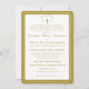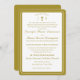 Design features the traditional format for a Catholic wedding invitation displayed in a lovely golden-colored font against a white background. Top displays the monogram of bride and groom on either side of a cross. A small heading is featured above as an arch. Design is framed by an elegant golden and white colored border.