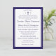 Design features the traditional format for a Catholic wedding invitation displayed in a navy-blue font against a white background. Top displays the monogram of bride and groom on either side of a cross. A small heading is featured above as an arch. Design is framed by an elegant navy and white border.