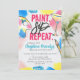 Adicione criatividade às suas divertidas garotas a noite fora com tinta e festa de solteira de cerveja cheia de cores e muitas bebidas adultas (vinho, alguém?). O design apresenta a tipografia "Pintura. sip.repetição", bem como os detalhes que você pode simplesmente personalizar com seu nome e informações de festas. Apresentando placas de tinta completas com placas de tinta amarelas, vermelhas e azuis, bem como paleta pintada à mão, pincel de tinta e vidro com fundo de mármore.