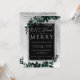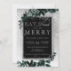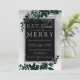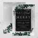 Coma, beba e seja feliz! Uma tipografia prateada moderna, chica e elegante convite de festas de Natal verde-aquoso floral com folhagem de folha de cor aquosa pintada à mão num gradiente de cinza com neve branca e flocos de neve. Perfeito para o Natal ou casamentos.